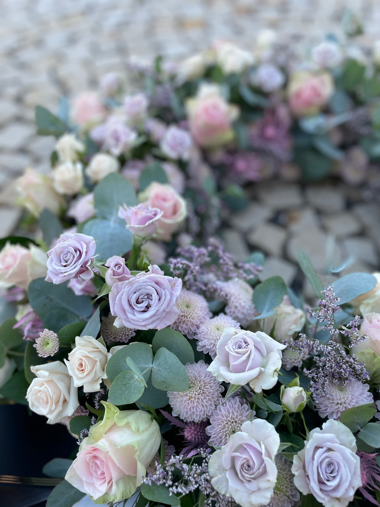 Všechny aranže lze přizpůsobit velikostí – od menších, velmi decentních vazeb až po výraznější dominantní kompozice vhodné k hlavnímu katafalku. Styl volím podle vašich představ: tradiční (např. kombinace bílých lilií, růží a zeleně), moderní (čisté linie, méně druhů květin, výraznější barevné akcenty) nebo maximálně střídmý a nenápadný, kdy pracuji s jemnými tóny a jednoduchými tvary.