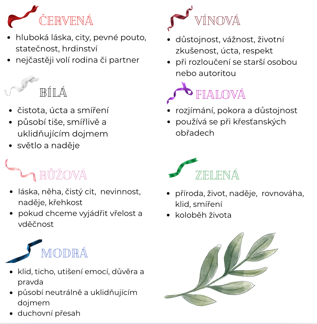 Součástí nabídky jsou také doplňky, které dodají aranži osobní rozměr. Připravím smuteční stuhy s individuálním textem, v různých barvách a šířkách, ladících s celkovým stylem květin. Na přání doplním kompozice o svíčky, lucerničky či drobné symboly – například křížek, anděla, srdce nebo motiv související se zájmy zesnulého. Vše volím tak, aby výsledek působil důstojně a vkusně.